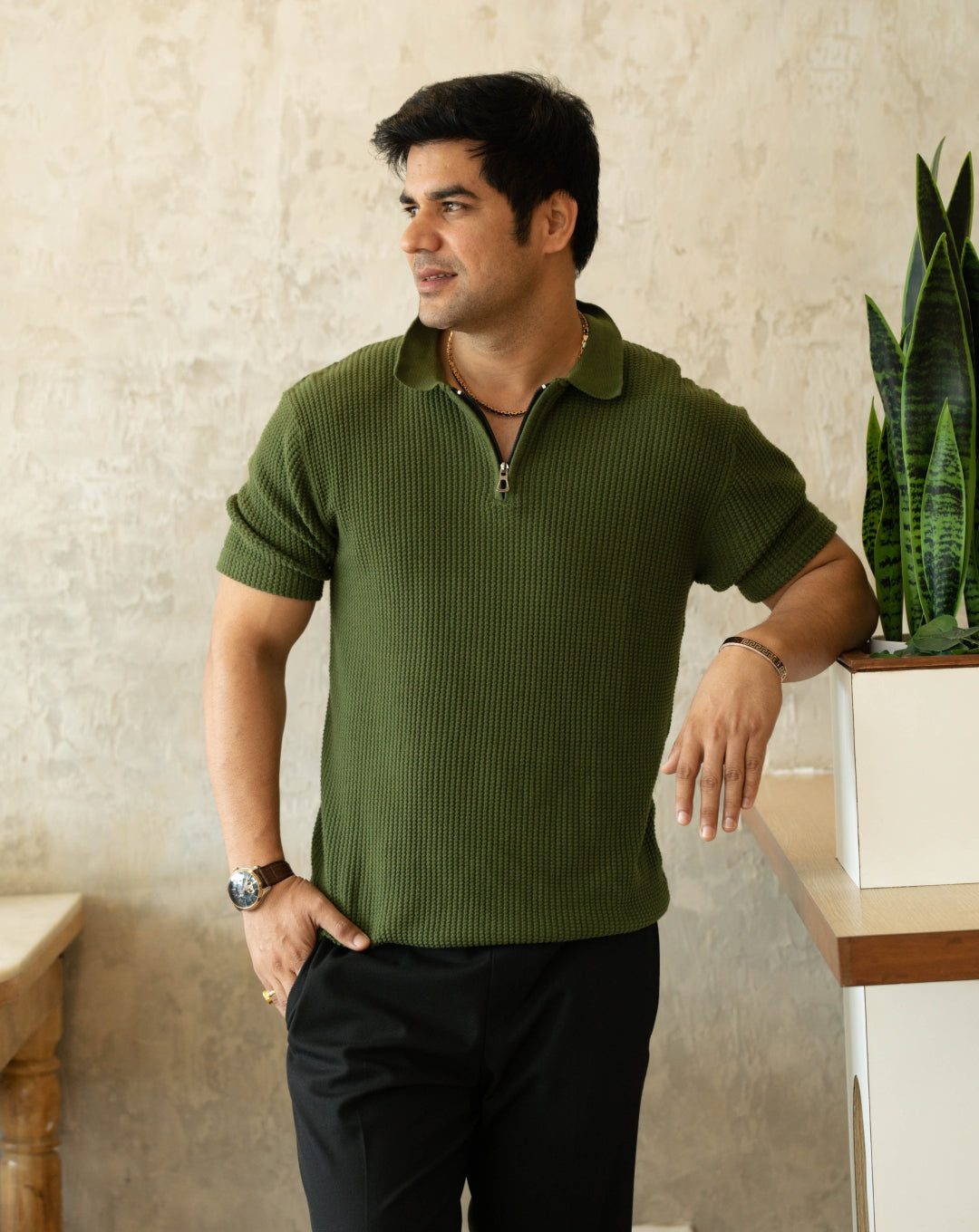 Waffle Polo T Shirt | Green | Regular | Kaam Bhari